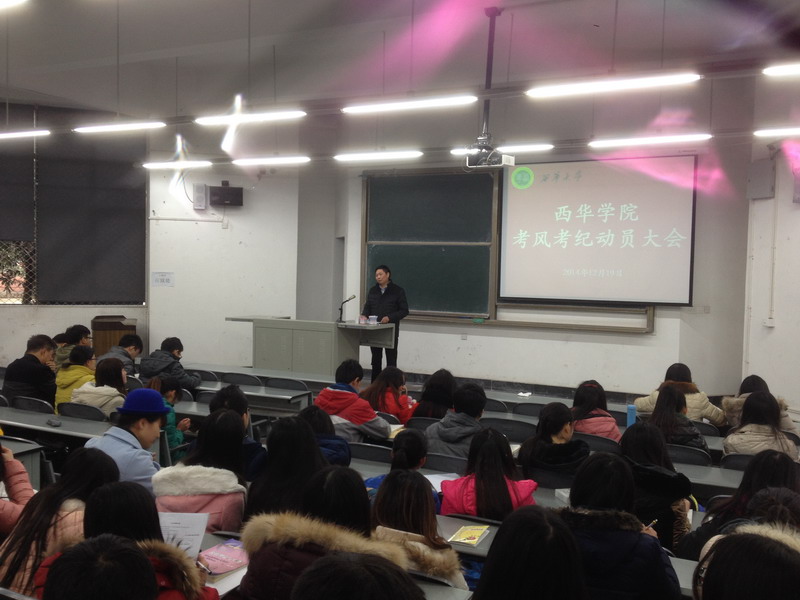 | 为保证英语四六级考试、研究生入学考试以及本学期期末考试等各项工作的顺利开展,督促同学们以积极的姿态迎接考试,严肃考风考纪,12月19日下午4:00,西华学院在6B-101多媒体教室举行考风考纪动员大会。动员大会由西华学院党总支书记兼副院长何承源主讲,学院办公室李绍军、李维春老师以及全体学生参加了此次动员大会。 会上,何书记首先阐述了此次动员大会的目的:希望全体同学严肃考风考纪,考出自己真实水平。接着,何书记以考试注意事项为切入点,告诫大家要严肃对待考试,做到诚信做人、诚实考试,不仅要通过自己的努力取得优异的成绩,更要从自身实际做起发扬优秀的传统美德。然后,何书记叮嘱同学们在全国大学英语四六级考试、研究生入学考试和期末考试中不要存在侥幸心理,考前认真准备,考出自己的真实水平。与此同时,他鼓励同学们树立信心,认真备考,预祝同学们都能取得优异成绩。就学生安全问题,何书记作出了具体阐述,叮嘱大家要注意人身及财产安全。最后,何书记提到学院2011级毕业班学生考研备考情况,并预祝同学们能取得优异成绩。 本次考前动员大会作为大学生诚信教育的重要组成部分,有利于增强同学们的诚信意识,自觉规范考试行为,同时对良好考风、学风、系风的建设起到一定的促进作用。