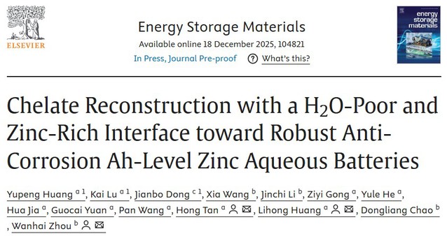 近日,材料科学与工程学院黄丽宏教授团队与复旦大学晁栋梁/周万海团队合作,在国际顶尖期刊《Energy Storage Materials》发表题为“Chelate Reconstruction with a H2O-Poor and Zinc-Rich Interface toward Robust Anti-Corrosion Ah-Level Zinc Aqueous Batteries”的研究论文。《Energy Storage Materials》2025年最新影响因子为20.2,是材料与化学领域的公认顶级期刊(中科院大类/小类一区Top期刊),同时被国际权威的自然指数评选为顶级期刊之一。西华大学黄丽宏教授、青年博士谭鸿和复旦大学周万海教授为论文共同通讯作者,西华大学硕士研究生黄玉鹏、芦凯为论文的共同第一作者,西华大学为第一完成单位。