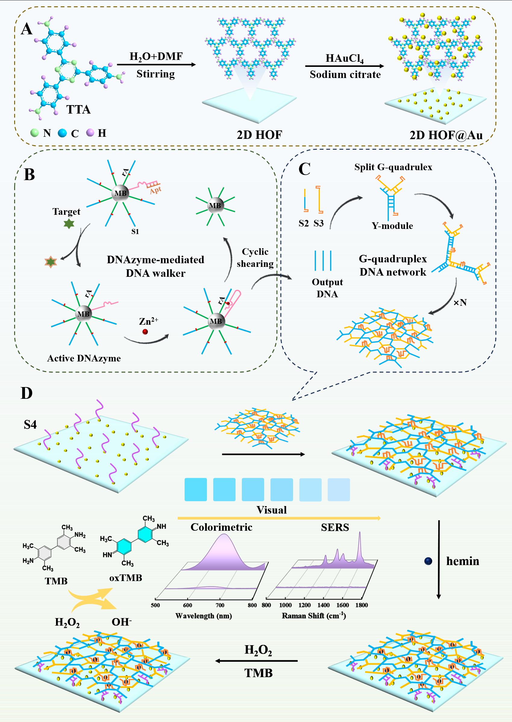 在本研究中,采用了一种二维氢键有机框架(2DHOF)@Au作为表面增强拉曼散射(SERS)基底并协同G-四链体DNA网络(GDN)作为高效的信号催化剂,实现了对洛美沙星(LOM)的低背景三模式检测。具有大比表面积和丰富-NH2功能基团的2D HOF作为负载大量Au NPs的理想纳米载体,从而产生强大的电磁场增强。随后,目标物诱导的DNA Walker高效剪切以产生大量输出DNA,进一步提高了检测系统的选择性。通过将DNA链S2和S3的末端区域设计为分裂的G四链体片段,并与输出DNA结合形成“Y形”结构,并进一步组装形成富含G四链体的DNA网络结构。该网络结构可以捕获大量的hemin,从而产生高效的过氧化物酶活性。值得注意的是,与采用纳米线作为载体来构建G-四链体结构的传统方法相比,这种DNA网络具有更出色的结构稳定性和稳定的催化性能。此外,将分裂后的G四链单元重新组合成完整的G四链结构,显著降低了背景信号,并最大程度地减少了非特异性阳性反应。最后,富含G四链结构的GDN与DNA修饰的2D HOF结合,将H2O2转化为羟基自由基以进一步催化四甲基联苯胺(TMB)转化为oxTMB,从而产生明显的颜色变化和SERS信号。通过该策略能够实现对LOM的SERS、比色和视觉检测,检测限分别低至6.54×10-14mol/L、3.27×10-11mol/L和5.31×10-11mol/L。该方法已成功应用于实际样本的检测,证明了其在实际应用中具有巨大的潜力。