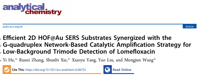 近日,理学院何毅课题组及合作者在分析化学TOP期刊《Analytical Chemistry》(中科院一区,自然指数期刊,IF=6.7)发表题为“Efficient2DHOF@AuSERSSubstratesSynergized withtheGquadruplexNetwork-BasedCatalyticAmplificationStrategyfor Low-BackgroundTrimodeDetectionofLomefloxacin”的研究论文。何毅博士为该论文第一作者兼通讯作者,2023级硕士研究生张润滋为学生一作,西华大学为第一通讯单位。