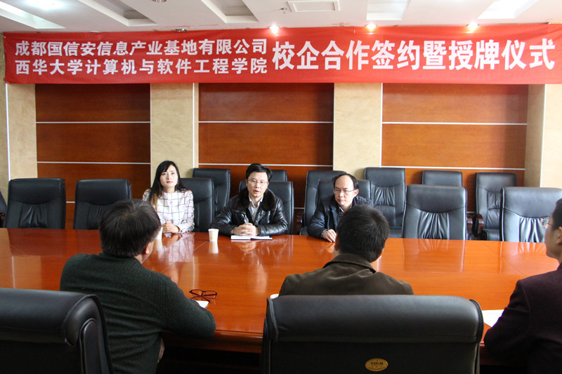 3月25日,在成都国信安信息产业基地,计算机与软件工程学院与国信安产业基地签署校企联合培养协议。学院党委副书记、副院长毕达平,学院副院长杜亚军,学工办主任刘凤丽,学院团委副书记李贵春以及国信安产业基地特聘教授赵定远,项目经理陈敏,总经理助理杨宇参与了协议签订仪式。