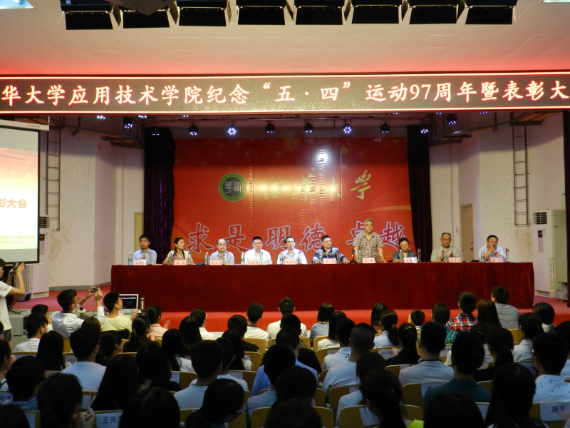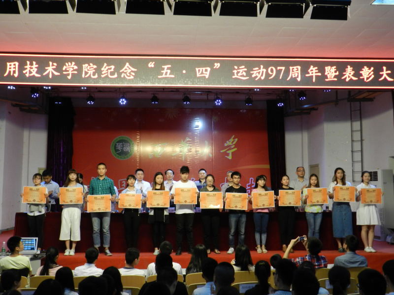 | 5月3日19:00,应用技术学院纪念“五·四”运动97周年表彰大会在音乐厅隆重举行。学院院长杨燕翔,院党委副书记兼副院长陈富国,副院长高华以及各部门负责人,辅导员出席了大会。学院团委学生会以及受表彰的先进集体代表和个人参加了大会。团委老师胡婷担任大会主持。 伴随着雄壮的国歌声,表彰大会正式开始。首先由院团委书记赵必鸣对学院团委工作进行总结汇报。他对过去一年来学院团委开展的活动、取得的成绩、不足等七个方面进行汇报,对参加各项比赛获奖的同学表示衷心的祝贺,并希望同学们再接再厉取得更大的成绩。接着院学生党总支书记王庆宣读了《应用技术学院五·四青年节表彰先进集体及个人决定》,对2014级会计4支部等13个团支部、董雨等10位十佳学习标兵、张高林等96名优秀共青团干部、冯佳等136名优秀共青团员进行了表彰,并告诫所有受表彰的集体和个人,成绩属于过去,要展望未来,做一个更加优秀的大学生。随后,学院领导对获奖的集体代表和个人代表进行颁奖。学生会主席唐祥茂作为学生代表发言,他感谢学院领导、团委学生会的辛勤培养与认可,并表示要发扬“五四”精神,做好祖国和中国共产党的接班人。 陈富国代表学院党委向受表彰的集体、个人表示诚挚的祝贺。他说,青年是推动历史发展和社会进步的一支生机勃勃、积极向上的队伍,新的时代给青年一代提供了广阔的舞台,肩负历史重任的青年,要进一步加强自己的紧迫感和使命感,继承“五四”运动光荣传统;要根据自身所长,发挥自身所用,快乐创新、勤奋创业、灿烂创青春,同时,他对全院同学提出了三点希望:希望同学们牢固树立社会主义荣辱观、道德观,争做社会主义四有新人;希望同学们珍惜时间,努力学习;希望同学们勇于创新,争做新时代的开拓者。 在慷慨激昂的团歌声中,本次表彰大会落下帷幕。