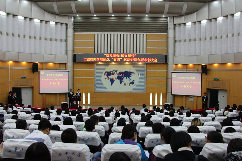 为进一步发挥先进团组织和个人的先锋模范作用,5月8日晚七点“奋发图强•薪火相传”工商管理学院纪念“五四”运动97周年暨表彰大会在四教报告厅举行。学院学工办与团委相关负责老师、受表彰代表以及团委学生会全体成员近300人参会。 大会在《光荣啊,中国共青团》的歌声中拉开帷幕。首先,大家观看了学院共青团工作视频《使命在肩•责任在胸》,视频回顾了过去一年学院团学工作取得的成果。随后,院团委组织部部长张敏同学从团建工作和宣传工作两个方面对学院2015-2016年度共青团工作进行了汇报,在过去的一年里,在校团委的指导下,学院团委积极开展实施“忠诚感恩、求索创新、务实担当、大爱奉献”的西华青年品格塑造工程,加强共青团的基层组织建设和干部队伍建设,在实现伟大“中国梦”的进程中,凝聚青春力量,勇担青春使命。 接着,大会播放了视频《工商,带给我温暖》和《工商,带给我感动》,全方位多角度展现了工管学子在学习生活工作中的良好的精神风貌。同时,学院表彰了2015-2016年度“五四”先进集体和优秀个人代表。随后,“西华青年五四奖章”获得者张旭同学和优秀个人代表刘盛悦同学分别进行发言,他们谈到作为新时代的青年学生,应该传承先进,严格要求自己,争做一名优秀的共青团员。 大会中学院团委书记刘波进行了总结发言,他肯定了学院团委在过去一年中所取得的成绩,并激励同学们在自己的大学时代中去做更多有意义的事,用鲜活的团员事迹,鼓励大家继续传承“五四”精神,争做新时代优秀青年。 最后,大会在全体成员的庄严宣誓中圆满落幕。 此次表彰大会进一步发挥了先进集体和个人的先锋模范作用,进一步促进了我院团学工作的良好开展,激励学院共青团员用自己的实际行动来赋予“五四”精神新的时代意义,让“五四”精神薪火相传,生生不息。