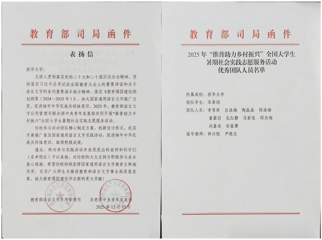 近日,教育部语言文字应用管理司、共青团中央青年发展部联合向西华大学发来表扬信,对马克思主义学院“彝声破圈·触见未来”实践团在2025年“推普助力乡村振兴”全国大学生暑期社会实践志愿服务活动中的优异表现予以表扬。