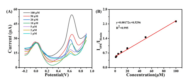 成功合成Hemin/CNT/Ti₃C₂Tₓ功能杂化材料,其兼具优异的富集能力、高导电性和催化活性,基于该材料构建的比率电化学传感策略,电化学信号与辛弗林浓度在1-100 μM范围内呈现良好的线性关系,检测限低至0.036μM,且具有出色的重复性、稳定性和抗干扰性。