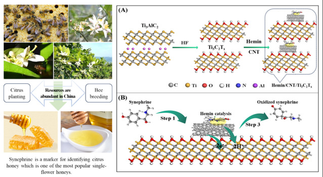 西华大学食品与生物工程学院依托“川渝共建特色食品重庆市重点实验室” 与重庆大学、重庆安全技术职业学院共同开展科研攻关,创新开发了基于功能化材料Hemin/CNT/Ti₃C₂Tₓ的比率电化学传感策略,并成功应用于蜂蜜样品中辛弗林含量的检测。本研究实现了柑橘蜂蜜的真实性精准快速鉴别,为柑橘蜂蜜质量控制提供了可靠保障,也为柑橘蜂蜜资源的进一步开发利用奠定了基础。