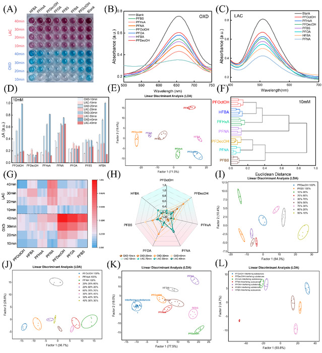 (A)不同PFAS对Fe/NC-@L31的类OXD活性和类LAC活性的比色响应图。不同PFAS存在下Fe/NC-@L31+TMB体系(B)和Fe/NC-@L31+2,4-DP + 4-AP 的紫外可见光谱(C)。(D)指纹图谱,(E) LDA, (F)层次聚类分析(HCA),(G)热图,(H)传感器阵列对浓度为10 mM的7种PFAS的雷达图。(J)浓度为1 mM时,传感器阵列对不同摩尔比的二元(I)和三元PFAS混合物的LDA图。(K)区分PFAS(1 mM)和干扰物质(水中常见干扰物质)的LDA图:HCO3−,CO32−,Fe2+, Cu2+, Ca2+, Mg2+, K+, HPO42−,干扰物质的浓度为50 mM)。(L)在干扰物质(50 mM)存在下PFAS(1 mM)的LDA图。