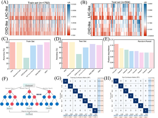 随机划分的训练集(A)和测试集(B)的热图。各种算法在评估训练集(C)和测试集(D)时的准确率,包括KNN、RF、SVM、MLP神经网络、SNM、GBDT算法。(E)随机森林分析中传感器阵列特征的重要性。(F)随机森林算法示意图。训练数据(G)和测试数据(H)的混淆矩阵。