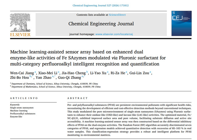 近日,理学院张国麒团队在国际权威期刊《Chemical Engineering Journal》(中科院一区Top,IF=13.2)发表题为“Machine learning-assisted sensor array based on enhanced dual enzyme-like activities of Fe SAzymes modulated via Pluronic surfactant for multi-category perfluoroalkyl intelligent recognition and quantification”的研究性论文,理学院2023级化学专业研究生蒋文彩为第一作者,数学系侯智博博士、化学系赵艳教授和张国麒博士为该论文的通讯作者,西华大学为第一通讯单位。