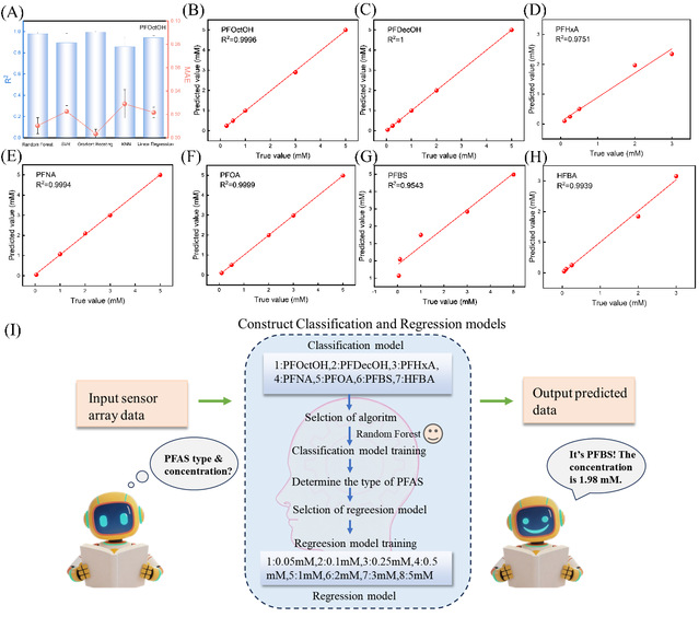 (A) 针对于预测PFOctOH的不同算法的R2和MAE比较。(B-H)机器学习采用相应的最优回归模型对PFAS类型进行分析后预测7种PFAS浓度的回归结果。(I)分类回归模型预测示意图。