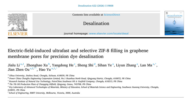 近日,理学院余昊科研团队在国际TOP期刊《Desalination》(JCR一区,中科院小类一区,影响因子9.8)在线发表题为“Electric-field-induced ultrafast and selective ZIF-8 filling in graphene membrane pores for precision dye desalination”的研究论文。余昊博士为通讯作者,马兰教授和西南交通大学欧建臻教授为共同通讯作者,2023级化学专业本科生李佳璐为第一作者,2024级化学专业本科生叶思含为共同作者,西华大学为第一通讯单位。