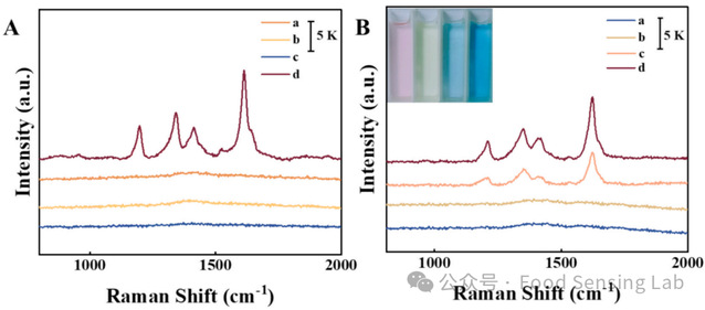 Fig. 1. Feasibility of the SERS sensor. (A) Raman spectra of AFRNBs@AuNPs (curve a); AFRNBs@AuNPs with TMB (curve b); AFRNBs@AuNPs@S2 with TMB (without BPS) (curve c); AFRNBs@AuNPs@S2 with TMB (with BPS) (curve d); (B) Raman spectra of oxTMB (without BPS and H2O2) (curve a); Raman spectra of oxTMB (with BPS, without H2O2) (curve b); Raman spectra of oxTMB catalyzed with HRP (with H2O2) (curve c); Raman spectra of oxTMB catalyzed with HOFs@HRP (with BPS and H2O2) (curve d).