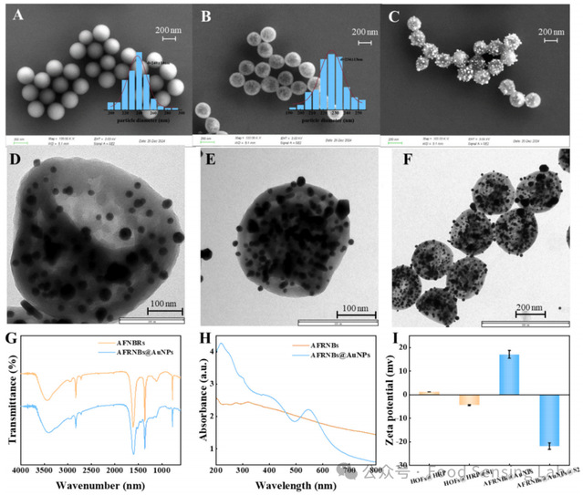 Fig. 2. (A-C) SEM characterization diagram of AFRNSs, AFRNBs, AFRNBs@AuNPs. (D–F) TEM characterization diagram of AFRNBs@AuNPs. (G) FT-IR spectra of AFRNBs, AFRNBs@AuNPs. (H) UV–vis spectra of AFRNBs, AFRNBs@AuNPs. (I) Zeta potential diagram of HOFs@HRP, HOFs@HRP@S1, AFRNBs@AuNPs, AFRNBs@AuNPs@S2.