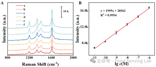 Fig. 4. (A) SERS spectra of BPS concentrations ranging from 1.00 × 10⁻¹¹ M to 1.00 × 10⁻⁶ M. (B) Relationship between the intensity of SERS and log concentration of BPS. Error bars represent mean ± standard deviation (n = 3).