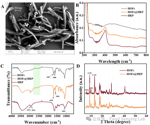 Fig. 3. (A) SEM characterization diagram of HOFs@HRP. (B) UV–vis spectra of HOFs, HRP, HOFs@HRP. (C) FT-IR spectra of HOFs, HRP, HOFs@HRP. (D)XRD spectra of HOFs, HOFs@HRP.