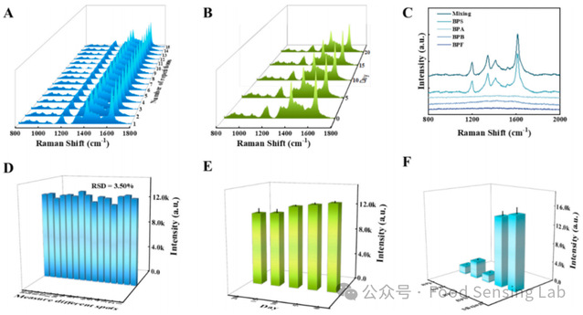 under natural conditions. (C) Selectivity of SERS biosensors for interfering compounds (BPA, BPB, BPF). (D) Histogram of Raman intensity at different positions on the substrate. (E) Histogram of Raman intensity at 1629 cm⁻¹ for SERS biosensors under natural conditions. (F) Histogram of Raman intensity at 1629 cm⁻¹ for SERS biosensors under different interferences. Error bars represent mean ± standard deviation (n = 3).