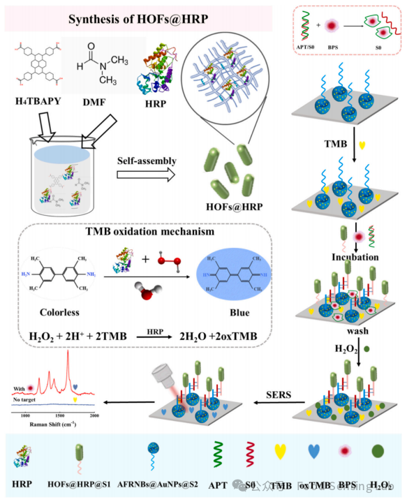 随着公众对环境和食品安全的日益关注,痕量双酚S(BPS)的检测变得至关重要。本研究基于氢键有机框架-辣根过氧化物酶复合物(HOFs@HRP)与碗状中空结构表面增强拉曼散射基底(AFRNBs@AuNPs),开发了一种超灵敏的表面增强拉曼散射生物传感器用于检测BPS。得益于优异的生物相容性与温和的合成条件,HOFs被用作HRP的保护载体,有效维持了酶的催化活性。同时,成功制备的碗状中空结构AFRNBs@AuNPs可作为高效SERS基底。当体系中存在BPS时,BPS与其适配体间更强的亲和力引发置换反应,促使HOFs@HRP与AFRNBs@AuNPs结合,从而催化TMB转化为oxTMB并产生可检测的拉曼信号。基于此机制,该生物传感器对BPS的检测限达1.28×10⁻¹² M。该方法为痕量BPS检测开辟了新途径,展现出广阔的应用前景。