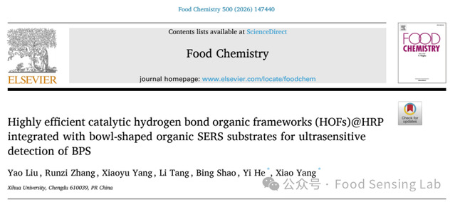 近日,食品与生物工程学院杨潇教授在食品领域TOP期刊《Food Chemistry》发表题为“Highly efficient catalytic hydrogen bond organic frameworks (HOFs)@HRP integrated with bowl-shaped organic SERS substrates for ultrasensitive detection of BPS”的研究论文。食品与生物工程学院杨潇教授和理学院何毅博士为论文共同通讯作者。