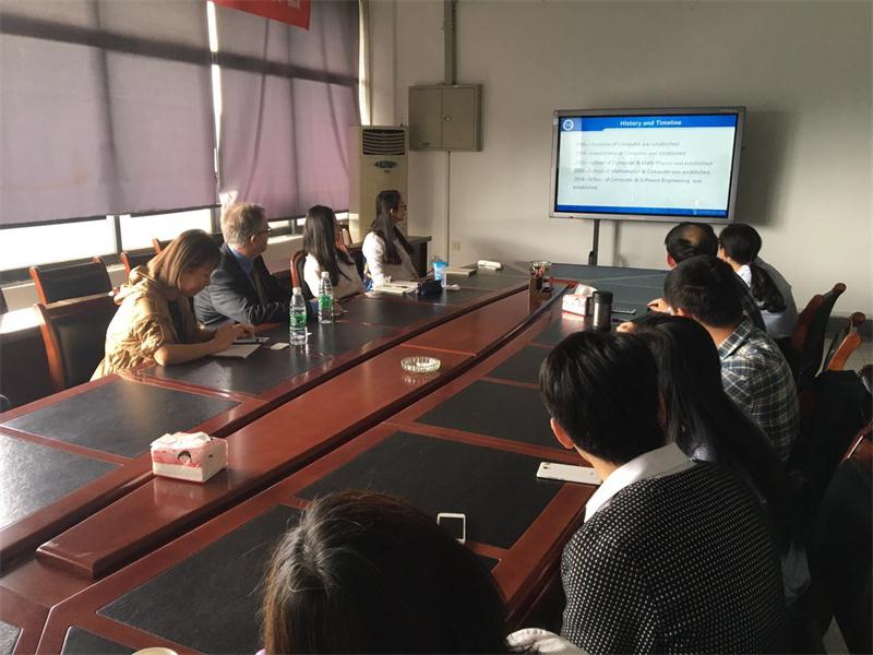 5月16日下午,瑞典Halmstad University的Torben Svane老师到计算机与软件工程学院交流。学院分管教学工作的副院长杜亚军、教师代表、有出国意向的学生代表参加了会议。 会上,杜院长代表学院做了关于学院师资、学科、科研情况、学生情况等报告。随后,Torben教授介绍了Halmstad University信息科学学院的基本概况。双方就共同进行科研项目合作(如:商场数据挖掘、机器人辅助教学、VR技术开发等)、互派留学生、师资出国深造等方面进行了进一步的合作探讨。 本次会议加强了双方的交流,为有意愿留学的同学和想要出国深造的老师提供了便利。