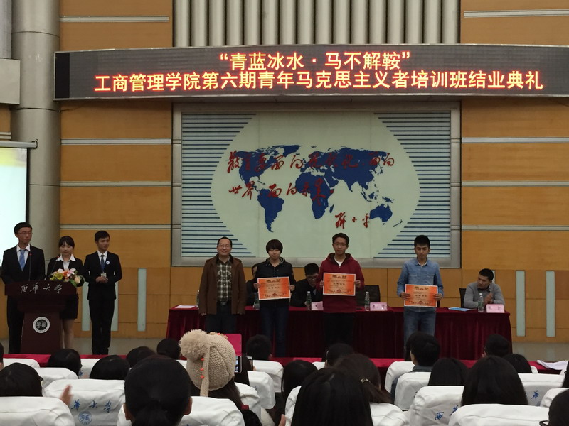 11月11日下午6点,工商管理学院在四教报告厅隆重举行了以“青蓝冰水·马不解鞍”为主题的第六期青马培训结业典礼。学院学工办及团委相关负责老师、青马培训讲师以及全体学员参与了此次大会。