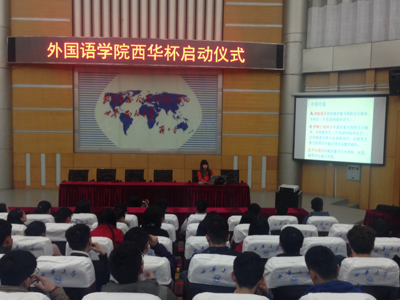 3月9日晚7点,外国语学院2016年“西华杯”大学生科技创新项目启动仪式在四教报告厅举行。学院团委书记曾渝理、2015级辅导员梁正科、学生会代表及全体2015级学生参加了此次启动仪式。