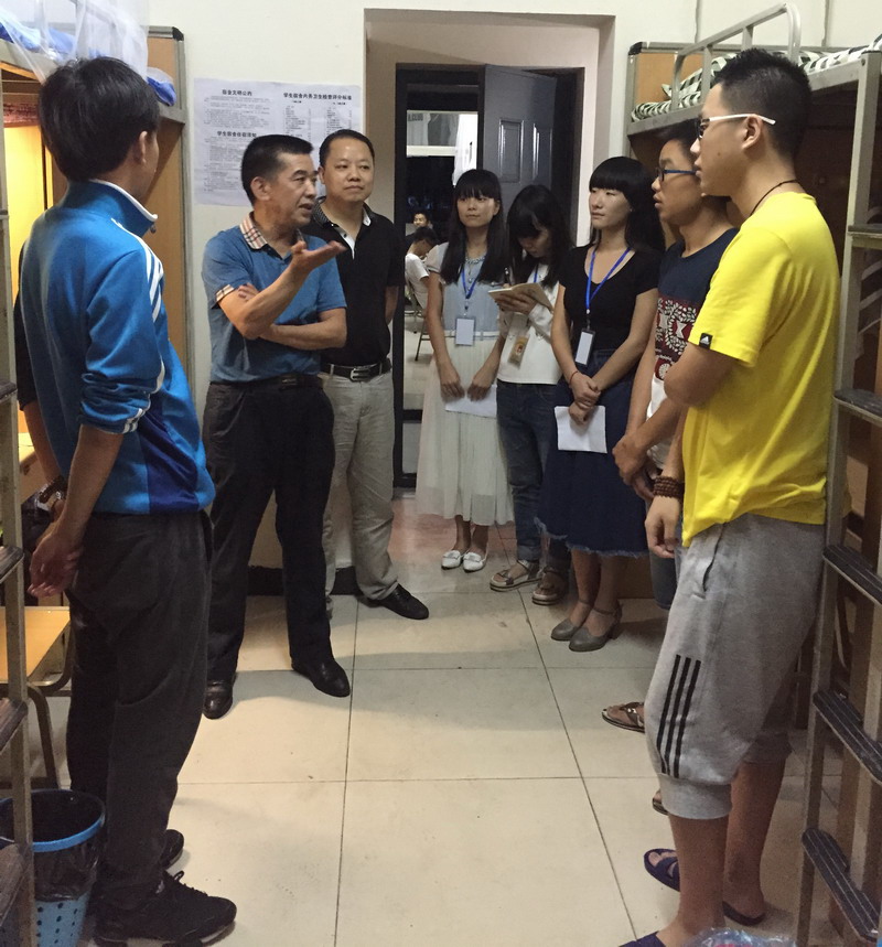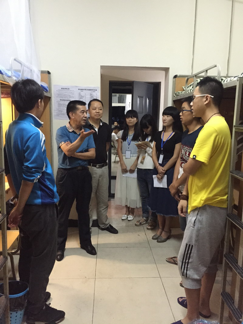 9月9日晚19:00,学院领导及部分老师一行分成三组,分别走访了研究生以及思想政治教育、社会工作本科生,看望并慰问已经入住的新同学。 学院党委书记刘曙光,学院团委书记、学工办主任李旭以及思想政治教育系系主任王贝一行走访看望了2015级思想政治教育50名本科生。刘曙光首先对新同学的到来表示欢迎,鼓励大家尽快融入大学学习和生活,多与老师,学长学姐交流。随后王贝向大家简要介绍了思想政治教育专业的概况,李旭则主要从近期工作安排、安全等方面作了具体布置。 学院副院长郑小明,学院社会工作专业硕士教育中心副主任朱琳博士等老师一行走访看望了2015级社会工作专业37名本科生。作为学院开设社会工作专业之后迎来的的第一批学生,学院领导和老师们每到一个寝室,都表达了对新同学诚挚的欢迎之情,亲切询问同学们的个人情况。同时朱琳老师还简要介绍了社会工作专业的概况以及发展方向等。 学院院长万远英,学院教学办主任冯冬老师等一行到研究生宿舍楼走访看望了72名研究生。万远英在表达了对各位新生的热烈欢迎之后表示,大家在研究生阶段一定要静下心来做学问,努力提高自己的专业知识与技能,真正成为对社会有用的人。研究生们也纷纷表示,一定谨记院长教诲,刻苦钻研,踏实学习。 学院领导、老师在迎新工作结束后走访看望新生,已经成为学院的一项传统,深入学生宿舍,与新生们亲切交流,既拉近了新生与老师们的距离,也增进了新生对于学院的认同感。新生们纷纷对学院和领导、老师为大家营造的良好环境和氛围表示感谢,并表示要奋发努力,不辜负学校、社会和父母的厚望。