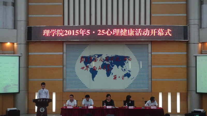为迎接即将到来的心理健康活动月,宣传心理健康的重要性,5月25日中午1点,理学院在四教报告厅举行了心理健康活动开幕式。学院党委副书记兼副院长李欣、学工办主任刘伟、院团委书记王筱莹、辅导员杨玉强、曾洁超出席了此次会议,2014级全体学生参加了此次会议。