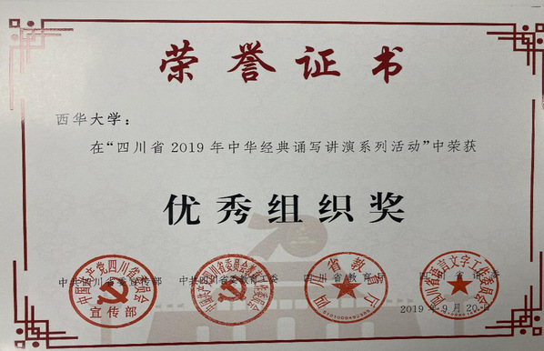 近日,由省委宣传部、省委教育工委、教育厅、省语委联合开展的四川省2019年中华经典诵写讲演系列活动落下帷幕,我校师生获得“经典咏流传”教师组二等奖,“写经典·书法类”教师组二等奖、学生组三等奖等奖项共6项,我校获优秀组织奖。