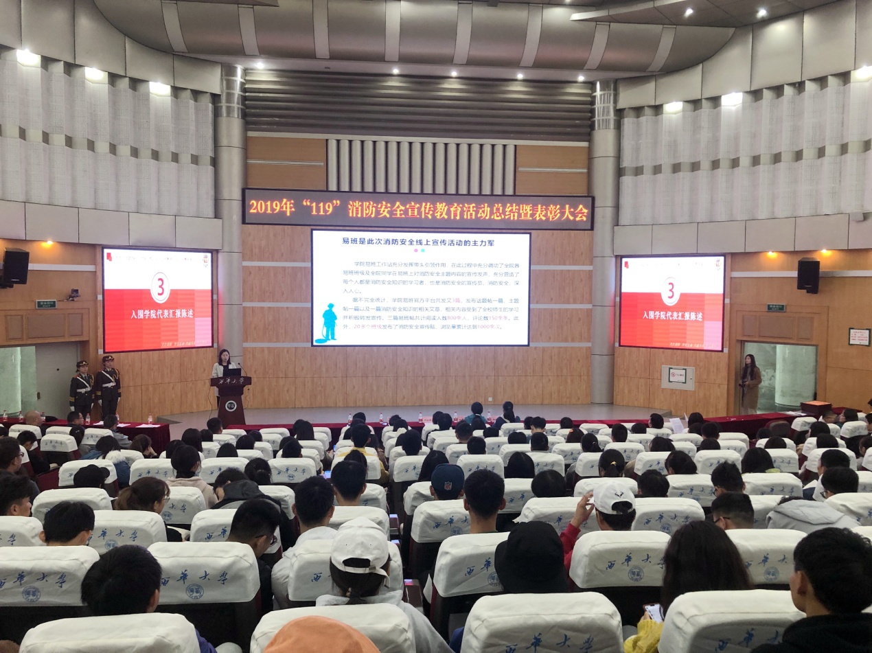 为加强消防安全知识宣传,构建平安西华。11月15日下午,西华大学2019年“119”消防安全知识宣传教育活动评选暨表彰大会在四教报告厅举行。本次“119”消防安全知识宣传教育活动主题为“人人共建共享消防安全”,活动时间自10月31日开始持续至11月15日。副校长刘小兵,党委宣传部、学生工作部、保卫处、校团委相关负责人,各学院分管学生工作的书记、副书记参加大会。