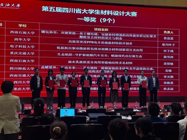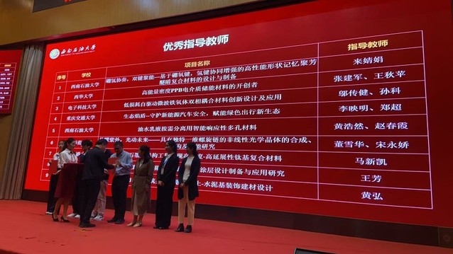 近日,第五届四川省大学生材料设计大赛决赛在西南石油大学举办。我校材料科学与工程学院参赛团队荣获一等奖1项,二等奖1项,张建军、王秋苹老师荣获优秀指导教师称号。