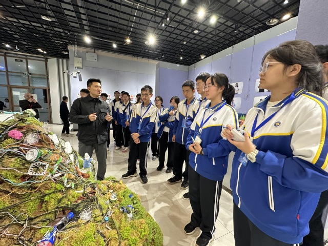 研学期间,同学们还参观了美术与设计学院“从客体到主体——公共装置与智能交互”课程展。废旧材料与智能技术的碰撞,点燃了艺术与科技融合的火花,引发阵阵赞叹。