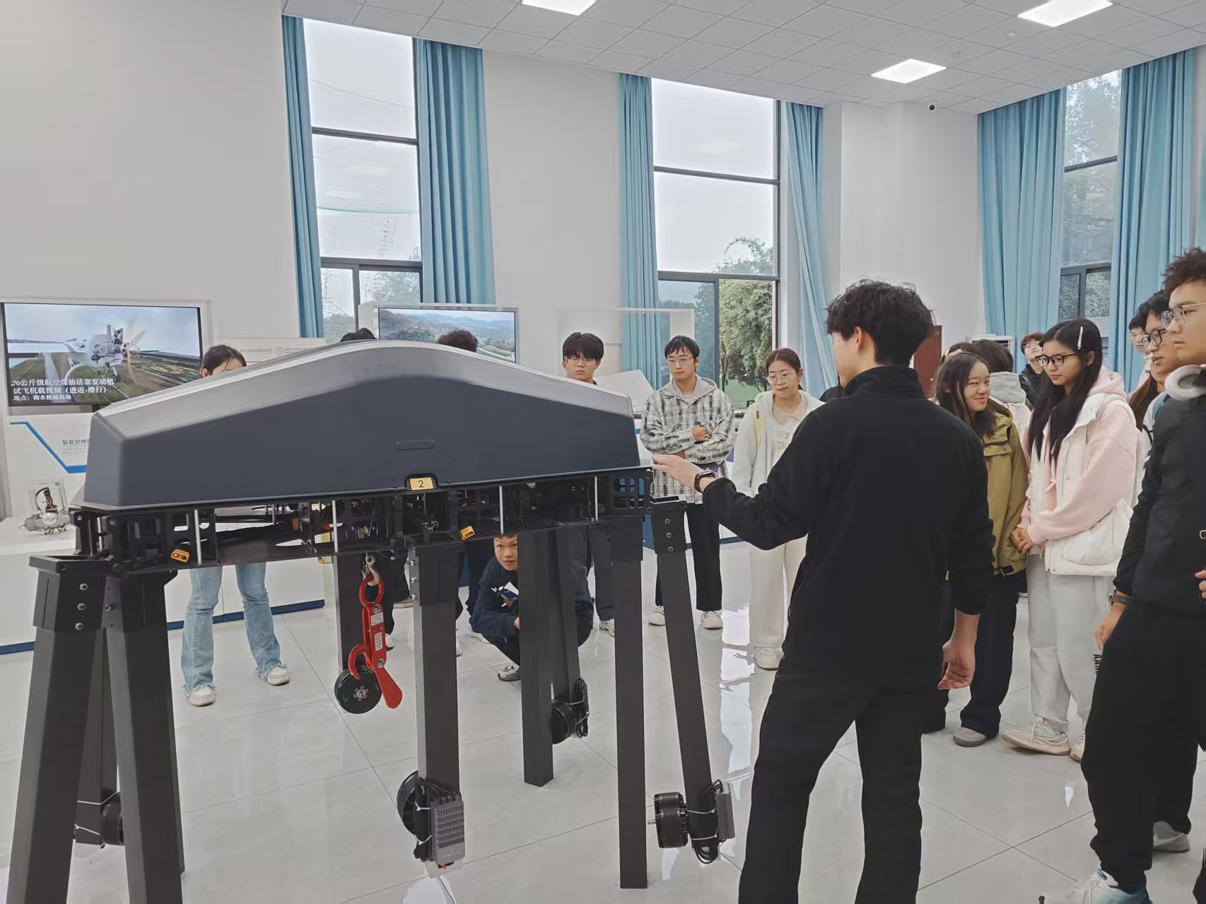 讲解员为同学们介绍展厅陈列(图为六旋翼无人机)