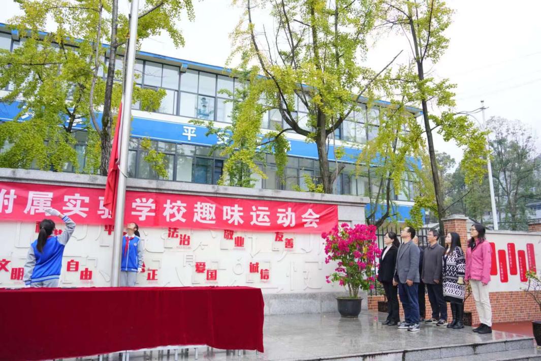 随后,全体师生举行了庄严的升旗仪式。在雄壮的国歌声中,五星红旗冉冉升起,少先队员们用标准的队礼表达了对祖国的热爱。附属实验学校副校长何承云为运动会致开幕词,他强调了体育运动对于青少年健康成长的重要性,并希望同学们在比赛中享受乐趣、增强体质、健全人格、锤炼意志。运动员代表承诺将遵守规则,尊重裁判,奋力拼搏。