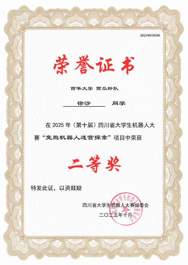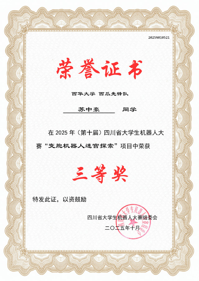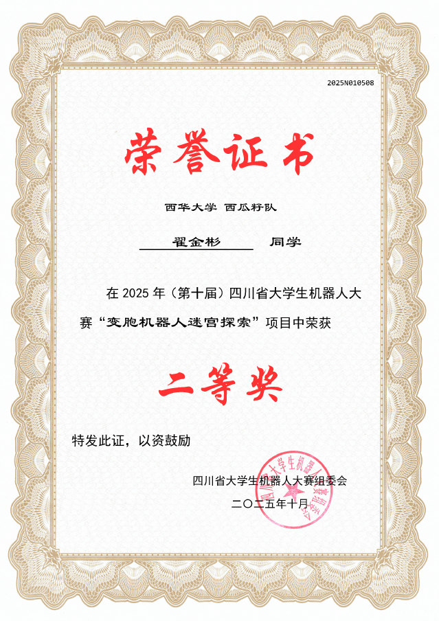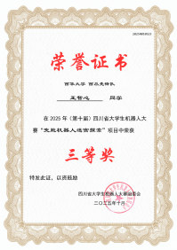 在变胞机器人迷宫探索项目中,我校学子在汽车与交通学院杨燕红老师指导下,“西瓜籽”队(队员:徐沙、何春生、翟金彬)获二等奖,“西瓜先锋”队(队员:苏中豪、张宇天、王智心、李平飞)获三等奖。两支战队的优异表现,展现了我校在机器人技术相关专业教学与科创实践中的扎实成果,彰显了西华学子勇于探索、敢于创新的青春风貌。