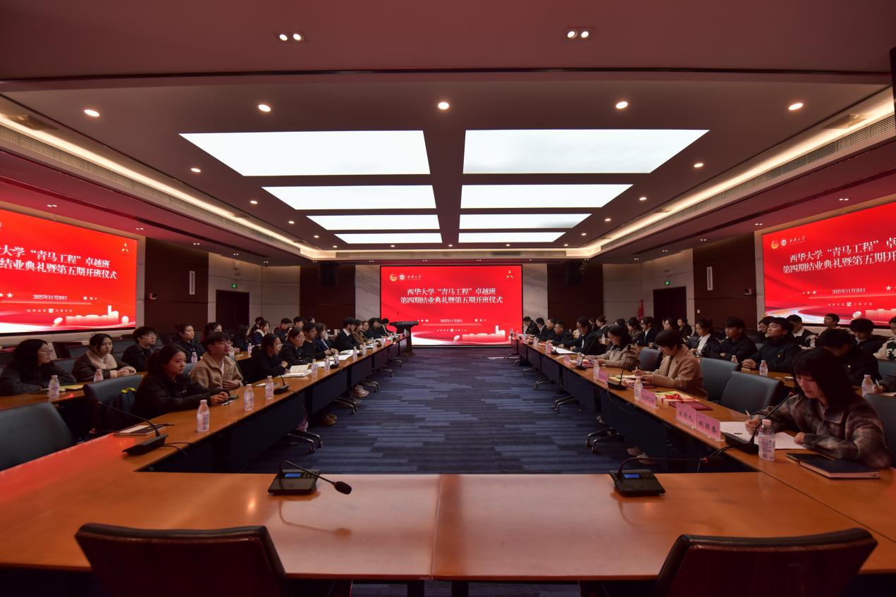 11月20日,学校在办公楼101会议室举行西华大学“青马工程”卓越班第四期结业典礼暨第五期开班仪式。党委常委、副校长费凌,党委组织部、党委宣传部、党委学生工作部、校团委、研究生院、马克思主义学院负责人,理论导师代表和全体青马工程学员参加仪式。