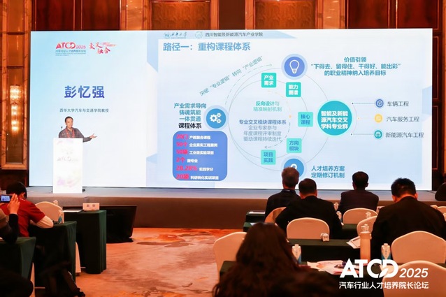 在“面向汽车‘新四化’的专业建设与协同发展”分论坛中,彭忆强教授发表题为“行企校深度融合、学练研夯基筑能:汽车新四化应用人才培养模式探索与实践” 的专题交流报告。报告中,彭忆强教授详细分享了汽车与交通学院在智能及新能源汽车专业群建设过程中的创新实践:一方面,学院与企业深度合作,共建产教融合特色课程,将企业前沿技术、真实项目案例融入教学全过程,实现课堂教学与产业需求无缝衔接;另一方面,学院创新采用“师生共创”模式推进科教融汇,联合打造虚拟仿真实验教学系统,有效提升学生的实践操作能力与创新思维。报告内容紧密结合行业发展趋势与人才培养痛点,具有极强的实操性与借鉴意义,引发了参会院校代表的广泛关注与热烈讨论。