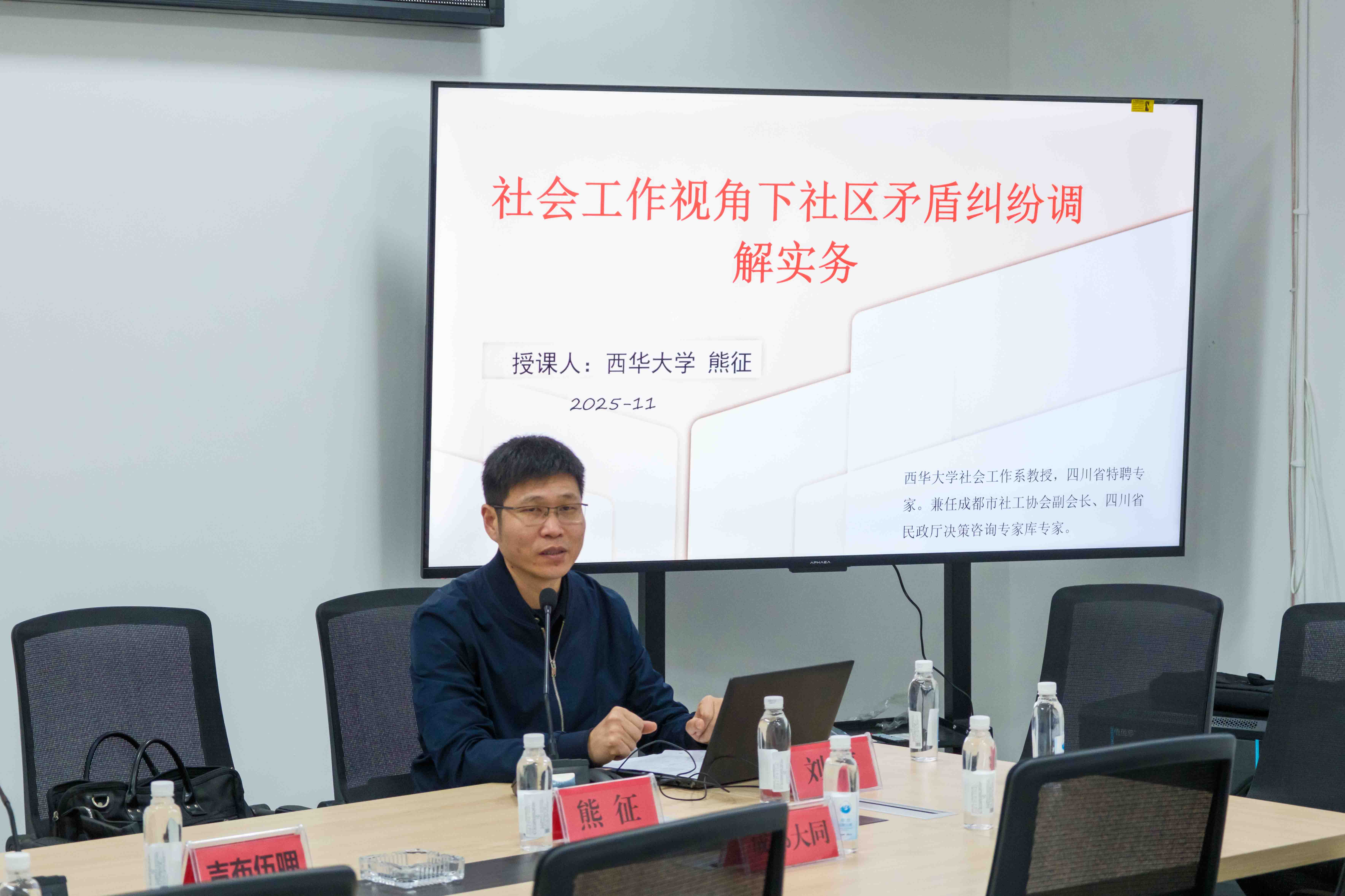 同一时间,社会工作与健康管理学院(心理健康教育中心)副院长熊征为全县三十余名社区工作者及本土社工进行了“社区矛盾纠纷调解”专题培训。课程紧密结合易地搬迁社区的治理难点,深入讲解了调解策略与沟通技巧,为一线工作者应对复杂社区情境提供了坚实的理论支撑与方法指导。