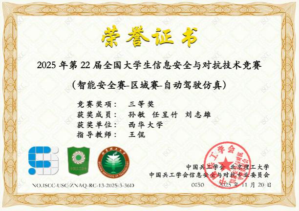 近日,2025年第22届全国大学生信息安全与对抗技术竞赛(ISCC)圆满落幕。汽车与交通学院学子凭借扎实的专业功底与出色的实践能力,在智能安全赛道中的“自动驾驶仿真”“复合智能体”两大核心赛项中脱颖而出,斩获国家级二等奖1项、优秀奖1项,区域一等奖2项、三等奖3项。