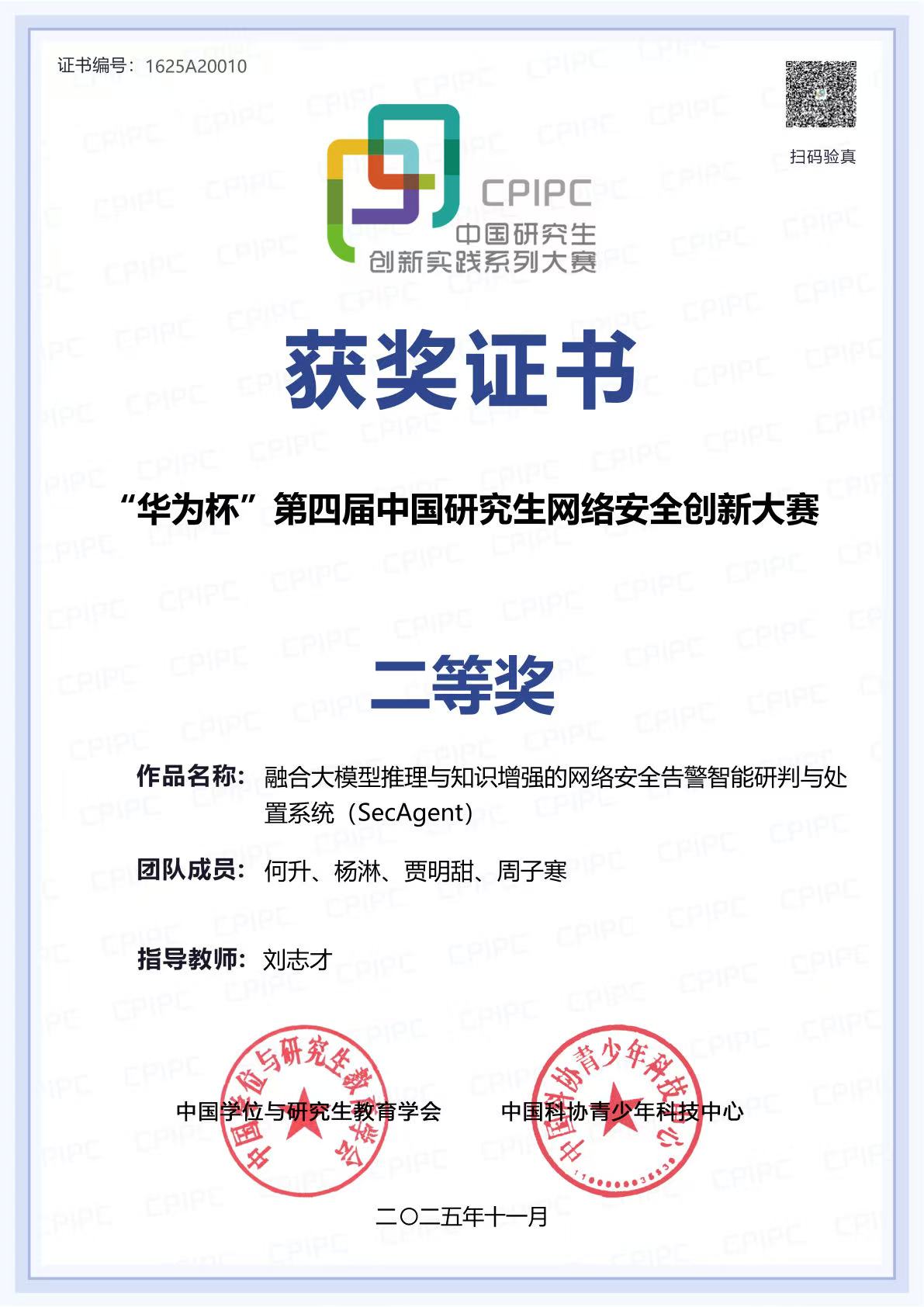 此次获奖的SecAI团队由计算机与软件工程学院研究生何升、杨淋、贾明甜、周子寒组成,刘志才老师担任指导教师。备赛期间,团队聚焦网络安全前沿技术,对参赛作品进行了反复打磨与持续优化。