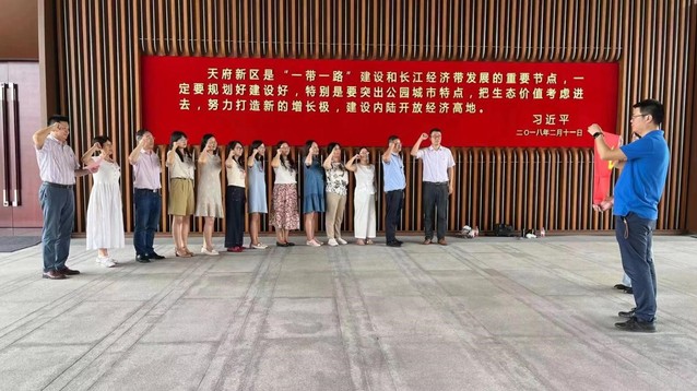 在天府新区规划厅,全体党员在习近平总书记关于天府新区建设的重要指示前,面对党旗、佩戴党员徽章、握拳过肩,由党支部书记樊群超同志领誓,庄重地重温入党誓词。