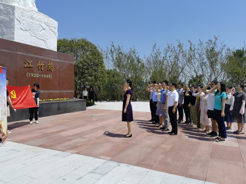 在江姐故里红色教育基地的红梅广场,全体教师党员向江姐雕像敬献鲜花并鞠躬致敬,缅怀江姐波澜壮阔的一生,表达对革命先烈的敬仰之情。随后,全体党员在江姐雕塑前庄严肃立,面对党旗,举起右手,重温入党誓词。