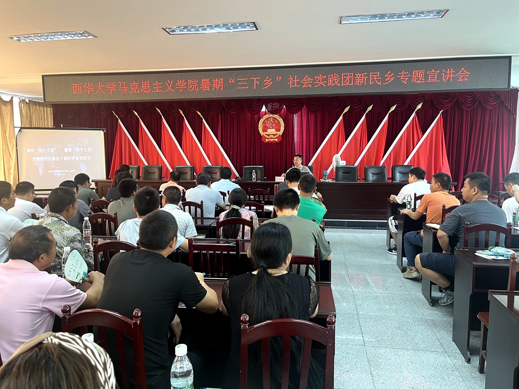 会议伊始,新民乡乡长张艳就马克思主义学院暑期“三下乡”社会实践团队一行的到来表示欢迎,并就新民乡的基本情况进行了交流报。随后,实践团指导老师、省委宣讲团成员郑小明作了题为《胸怀“国之大者”,着眼“两个大局”——把握新时代基层干部的使命和担当》的专题宣讲。
