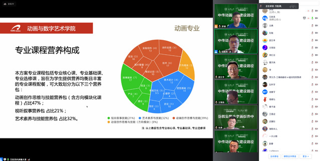 7月14日下午,美术与设计学院动画一流专业建设之专家论坛第5讲圆满举办。应美术与设计学院邀请,中国传媒大学动画与数字艺术学院动画专业系主任艾胜英副教授以“中传动画专业建设路径”为题,就国家一流本科专业建设点的建设思路,以及人才培养等方面的思路和经验进行介绍。讲座由美术与设计学院党委书记屈立丰主持,院长孟凯宁,副院长黄静、张玉萍,动画专业、视觉传达设计专业教师代表、设计学硕士点动画与数字媒体艺术方向研究生及其他高校师生共100余人参加了本次线上讲座。