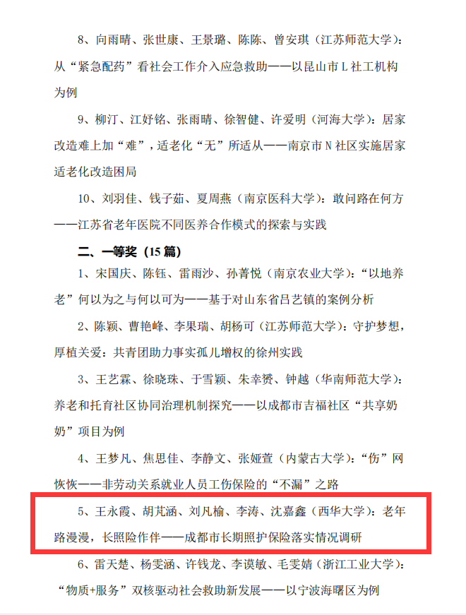 近日,由河海大学、南京大学、南京农业大学、南京师范大学、江苏省老年学学会联合主办,河海大学公共管理学院承办的“第二届大学生社会保障案例大赛”决赛以线上形式举行。我校法学与社会学学院冉连教师指导的本科生团队(团队成员王永霞、胡芃涵、刘凡榆、李涛、沈嘉鑫)勇创佳绩,最终获得一等奖。