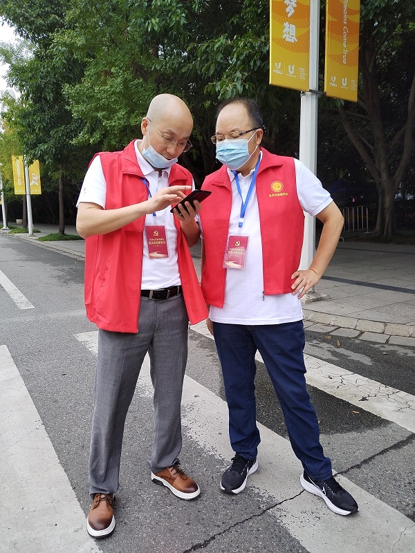 学院党委书记周良辉(右一)和党委副书记郭忠林(左一)参与志愿服务