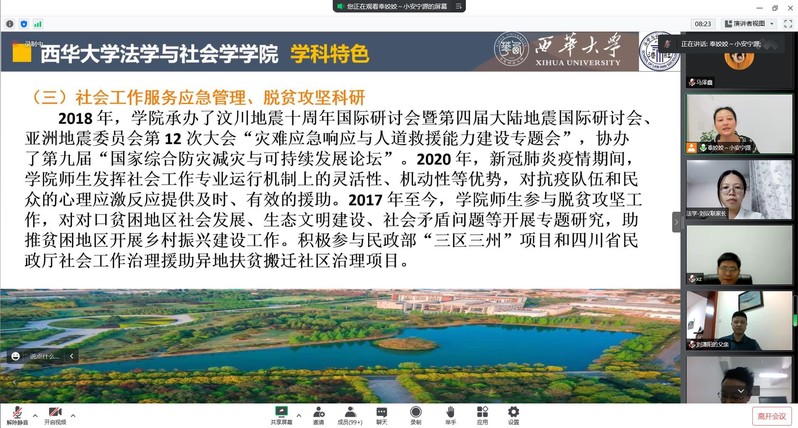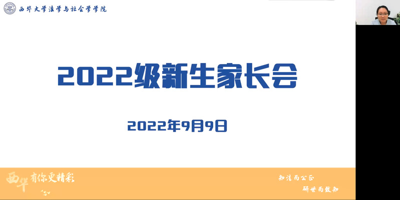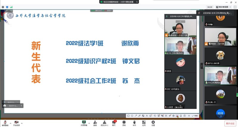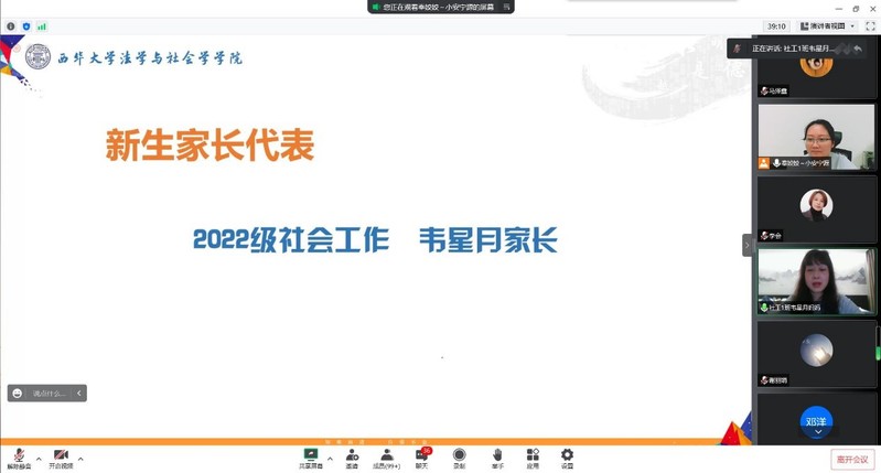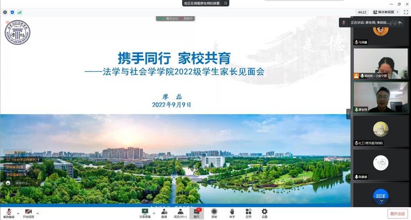 为做好疫情期间的家校互联工作,帮助2022级新生更好地融入大学生活,促进家校沟通,凝聚教育合力,9月9日晚,法学与社会学学院采用线上会议的方式举行2022级新生家长见面会。学院领导班子、各新生辅导员及全体新生家长参加。本次会议由学院学工办主任奉姣主持。