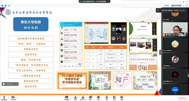 随后,奉姣向各位家长展示近段时间新生入学教育的开展情况。本次新生入学教育共分为线上入学教育、集中于学教育及养成教育三个阶段进行。特别是学院今年为新生设立的“‘易’路携手,共赴青春之约”——法社2022级萌新入学打卡活动和集中入学教育系列活动均受到新生的一致好评,新生们也将这段时间的所思所想、所感所悟通过文字、照片等形式进行分享。