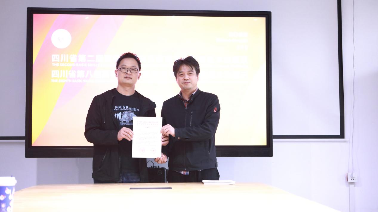 院长向琛子(右)为音乐系系主任张国仲(左)颁发表扬信