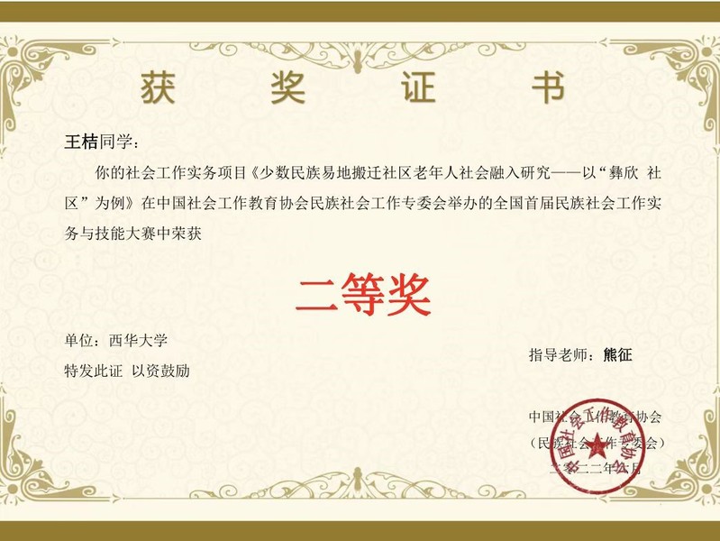 近日,中国社会工作教育协会正式公布第一届“全国民族社会工作实务与技能大赛”获奖名单,并颁发获奖证书。在法学与社会学学院熊征教授的指导下,2020级社会工作专业硕士研究生王桔申报的《少数民族易地搬迁社区老年人社会融入研究——以“彝欣”社区为例》,荣获“全国民族社会工作实务与技能大赛”二等奖。