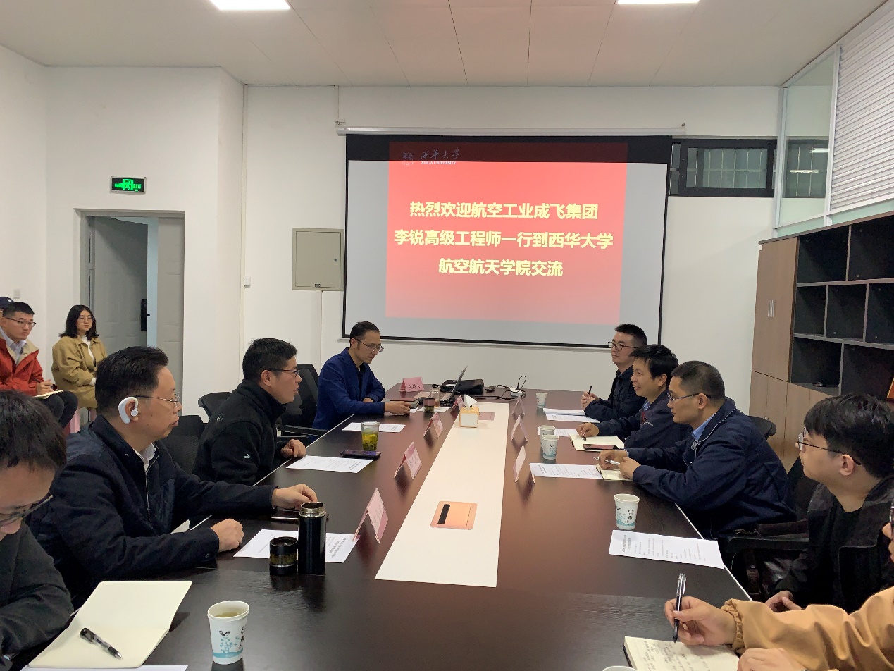 11月3日,成都飞机工业(集团)有限责任公司主任设计师、高级工程师李锐一行来校开展合作交流。双方在航空航天学院8-526会议室举行交流座谈会。航空航天学院党总支书记徐元彬、副院长杜海、西华大学教育部工程中心特聘副主任陈金良、教师代表韩志强、徐江等以及学院研究生参加了座谈。座谈会由杜海主持。
